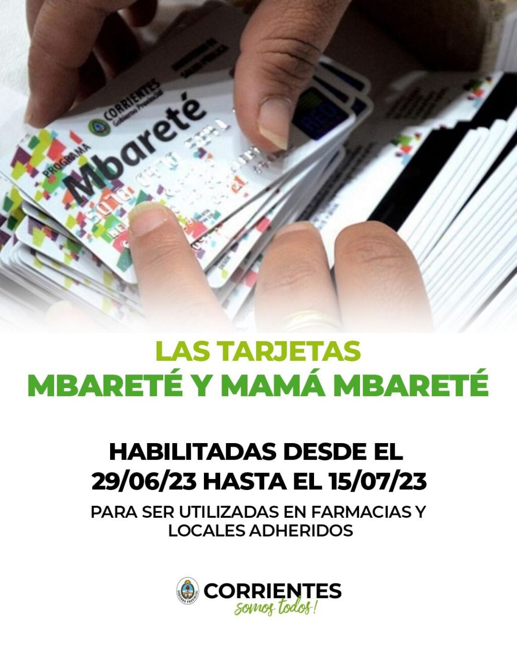 El Gobierno provincial, a través del Ministerio de Salud Pública, a cargo de Ricardo Cardozo, comunica que las tarjetas Mbareté y Mamá Mbareté se encuentran habilitadas desde el día de la fecha 29 de junio hasta el 15 de julio de 2023 inclusive, para ser utilizadas por los beneficiarios de las mismas.
