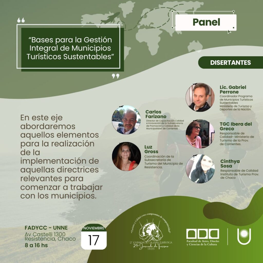 Por otra parte, “Bases para la gestión integral de municipios turísticos sustentables” estará a cargo de Gabriel Perrone, coordinador de Municipios Turístico Sustentables del Ministerio de Turismo y Deportes de la Nación; Iberá Del Greco, responsable de Calidad del Ministerio de Turismo de Corrientes y Cinthya Sosa, responsable de Calidad del Instituto de Turismo del Chaco.