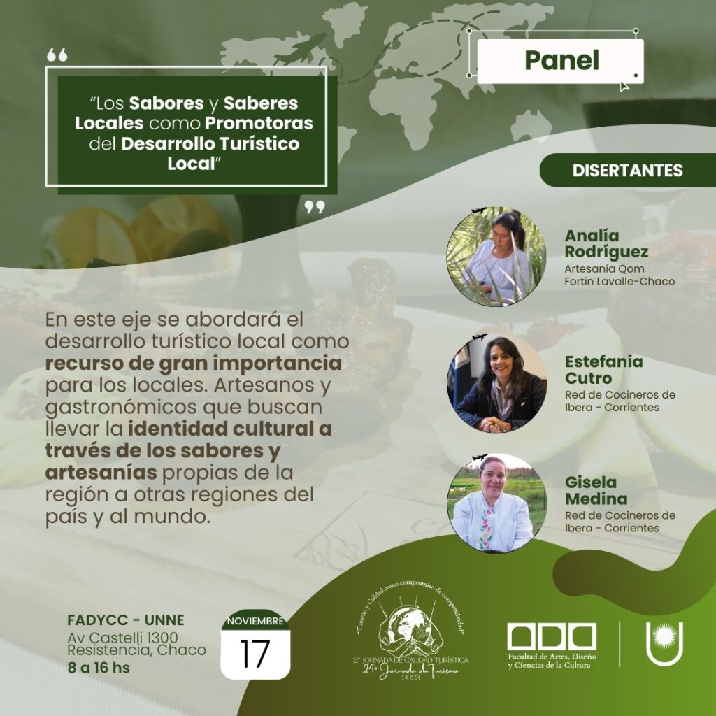 “Los sabores y saberes locales como promotores del desarrollo local” tendrá como expositores a Analía Rodríguez, artesana Qom de Fortín Lavalle (Chaco); mientras que en representación de la Red de Cocineros del Iberá (Corrientes) lo harán Estefanía Cutro y Gisela Medina.